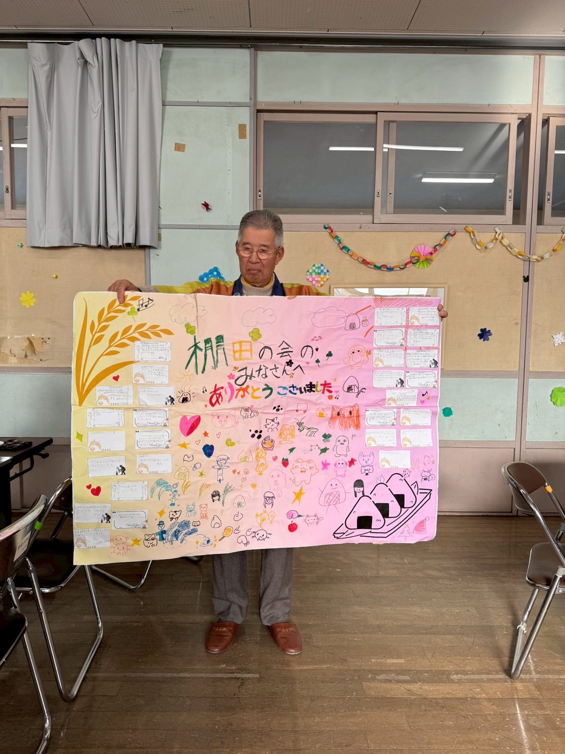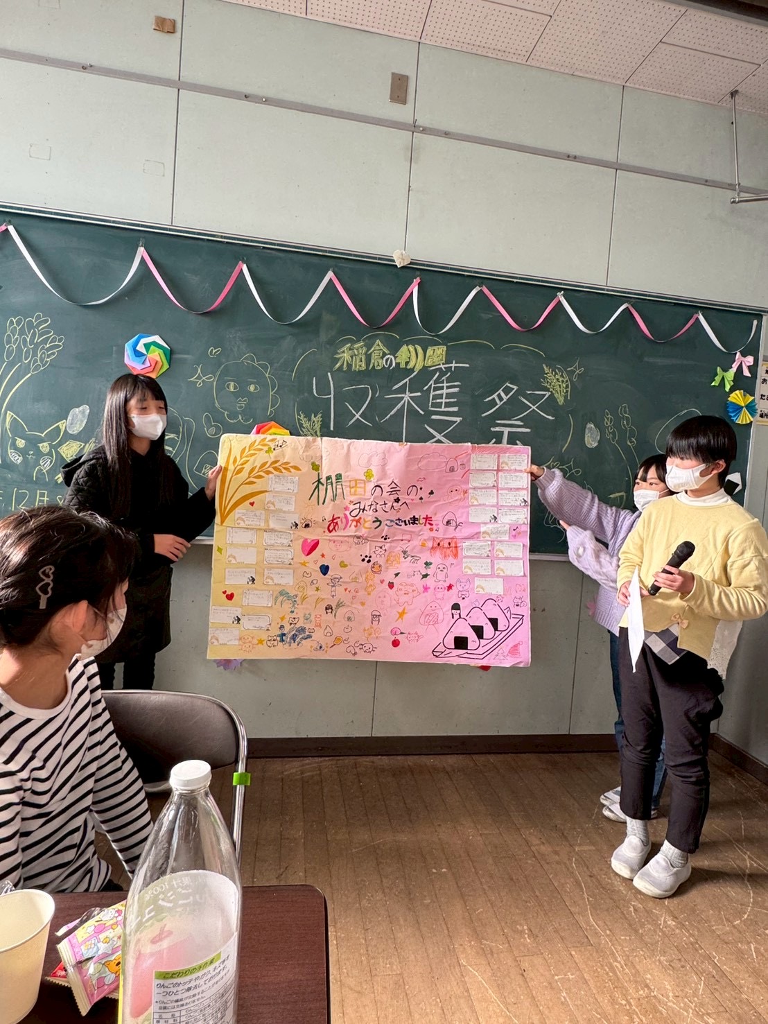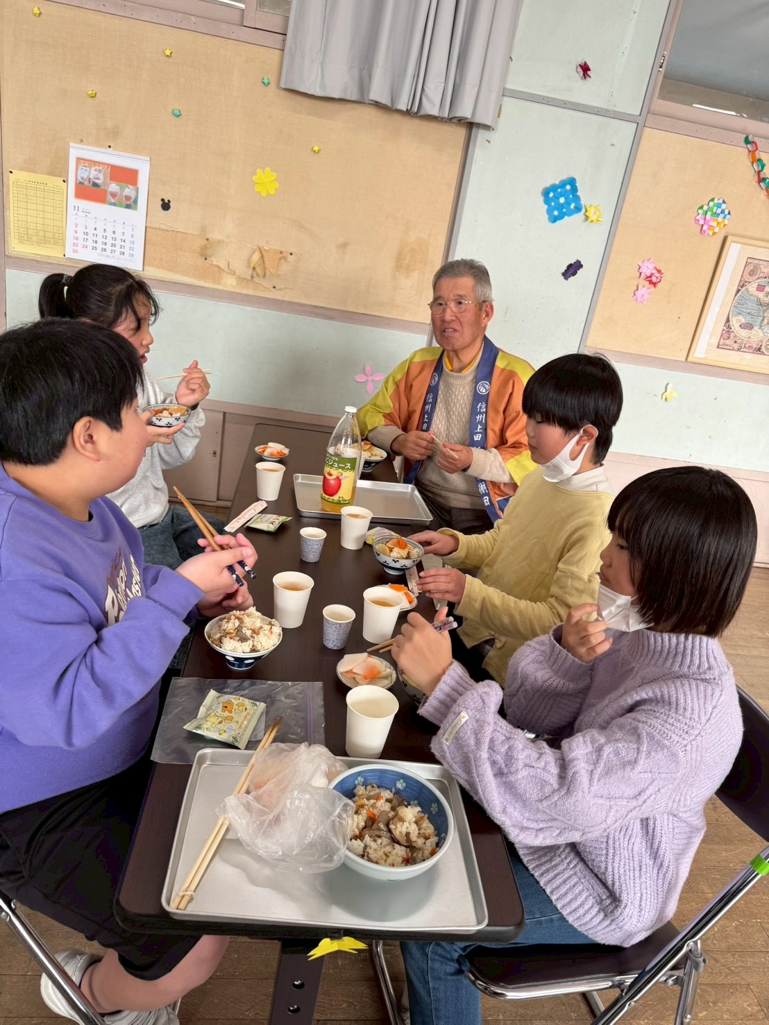 令和7年12月8日(月)に、豊殿小学校5年生が1年間のお米作りの感謝をこめて棚田保全委員との昼食会交流会を開催しました。